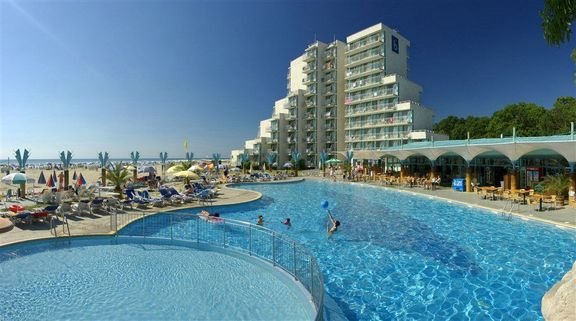Devítipatrový terasovitý hotel leží v jižní části střediska u přírodní rezervace Baltata, přímo na pláži.