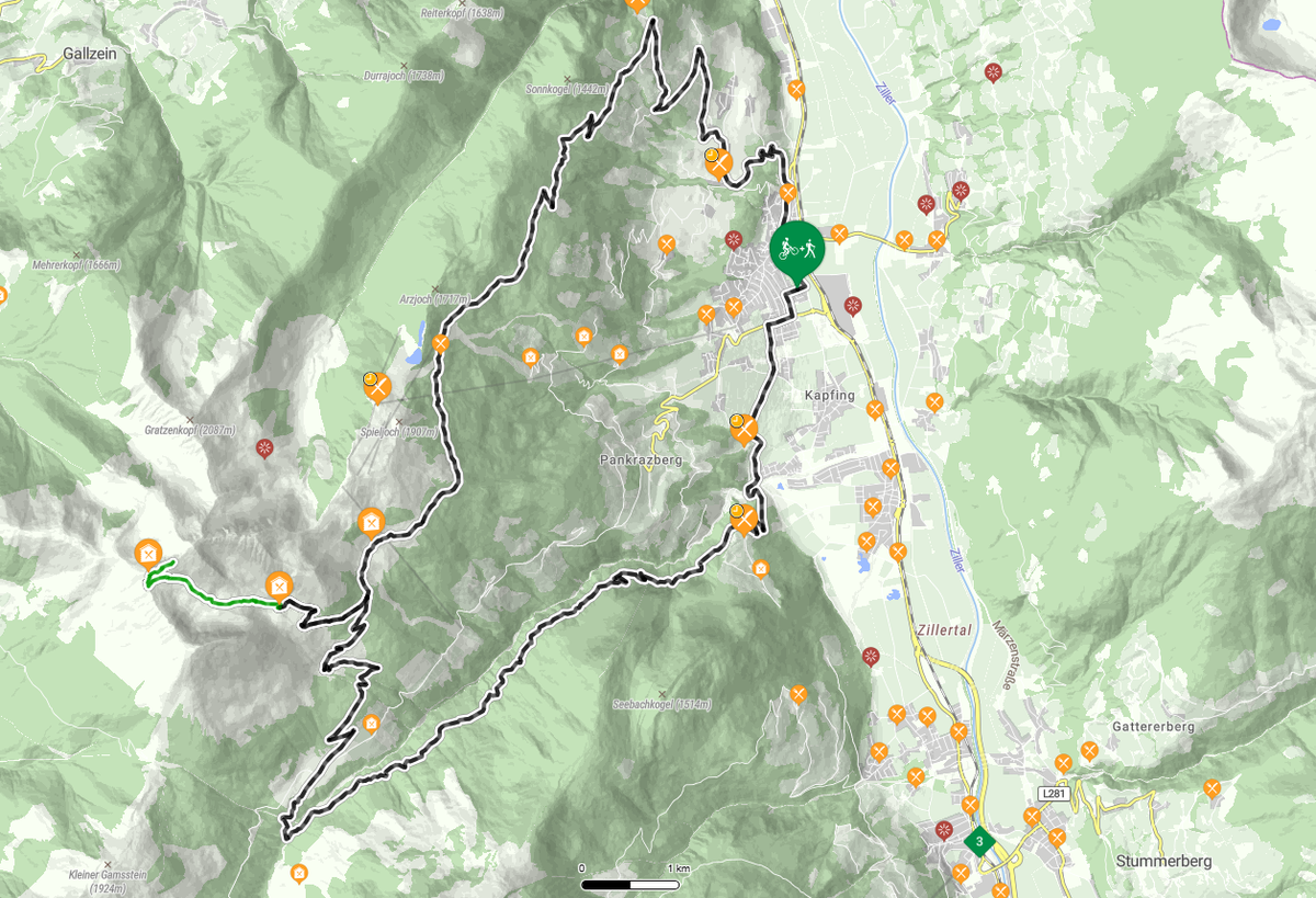 Po dokončení pěší části následuje návrat na kole po dobře vybudované Hochfügenské silnici. Čeká vás příjemný a svižný sjezd po slunných svazích mezi květinovými loukami a tradičními horskými statky přes Pankrazberg zpět do Fügenu.