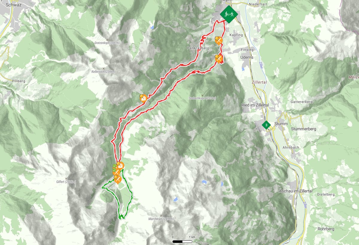 Trasa startuje ve Fügenu a vede nejprve pozvolným stoupáním mezi loukami a poli směrem k obci Uderns. Kolem malebně položeného kostela sv. Pankráce se vjíždí do údolí Finsinggrund, odkud cesta pokračuje několika zatáčkami směrem na Kupfnerberg a dále po lesních a šotolinových cestách hluboko do horské krajiny.