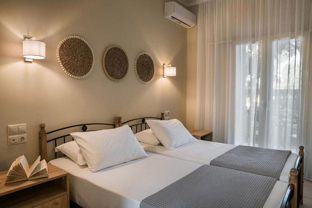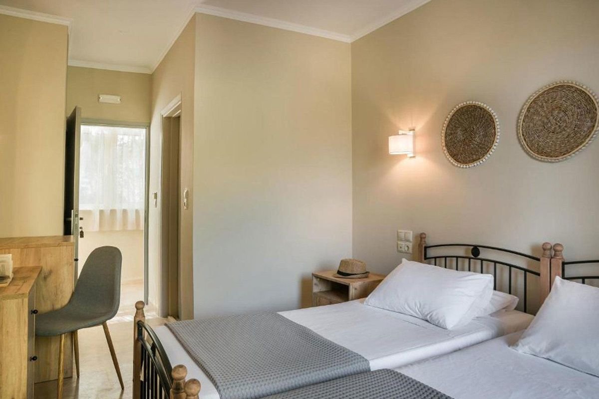Písčitá pláž Makris Gialos s pozvolným vstupem do moře je vzdálena přibližně 450 m od hotelu, další pláže Paliostafida cca 750 m, Platis Gialos 800 m, Gradakia přibližně 1 km.