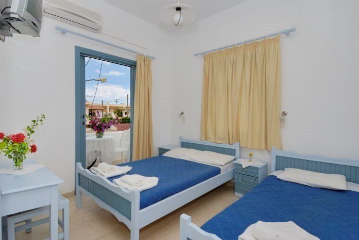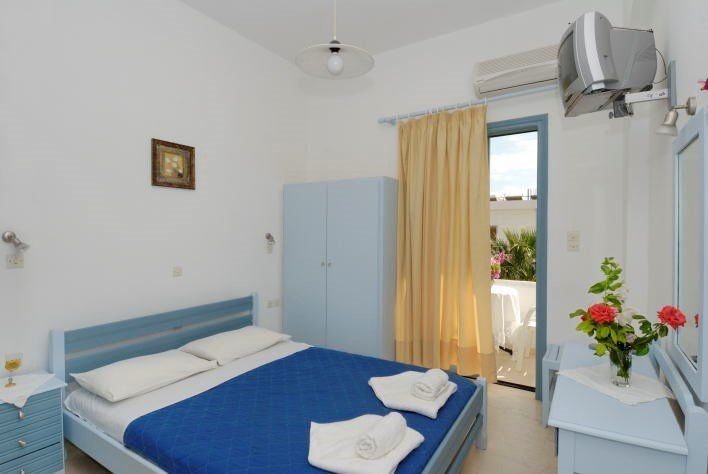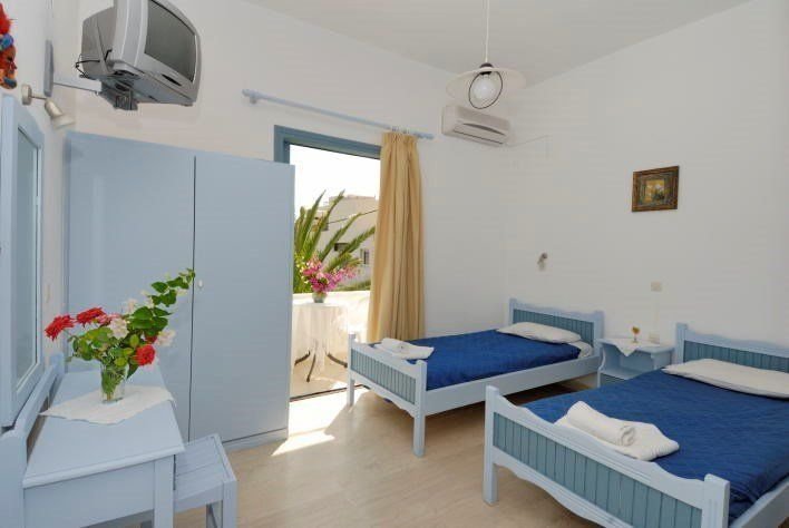 Dvoulůžkové pokoje s možností jedné přistýlky (pouze pro dítě) jsou vybavené vlastním příslušenstvím (koupelna, WC), SAT/TV, kuchyňským koutem (vařič, lednička, kávovar), který je opticky oddělený, a balkonem (stůl, židle). Možnost bezplatného WiFi připojení. Klimatizace za poplatek (cca 7 EUR/den).