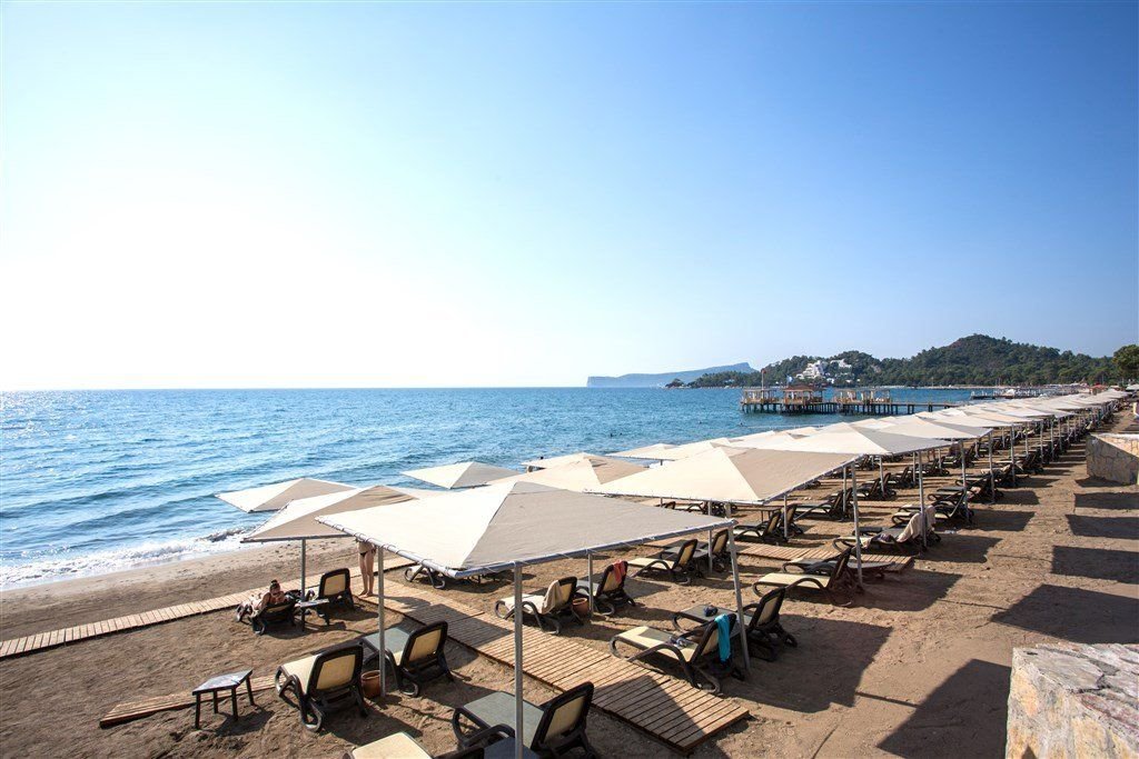 Písčito-oblázková pláž s pozvolným vstupem do moře se nachází přímo u hotelu, lehátka a slunečníky zdarma.