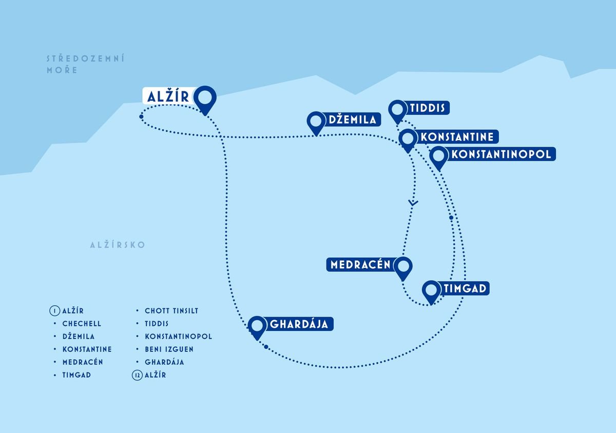 Alžírsko – poklad severní Afriky mezi Saharou a Středozemním mořem. Vydejte se s námi do Alžírska, země fascinujících kontrastů, kde se snoubí římské dědictví, arabská kultura a saharská poezie. Projdete se historickým Alžírem s jeho koloniální elegancí, navštívíte Cherchell, někdejší římskou Caesareu, i dechberoucí antické město Džemila, které patří k nejzachovalejším v celé Africe. V Konstantině, městě visutých mostů, pocítíte dramatickou krásu skalních kaňonů, zatímco Tiddis a Timgad vám odhalí stopy dávné římské civilizace. Zastavíte se u jezera Chott Tinsilt, uvidíte královskou hrobku Medracén i mystickou Ghardaïu, berberské město zapsané na seznamu UNESCO, kde se čas zastavil. Alžírsko vás okouzlí autentickou atmosférou, tichou krásou Sahary a dotekem historie, která se tu psala tisíce let.